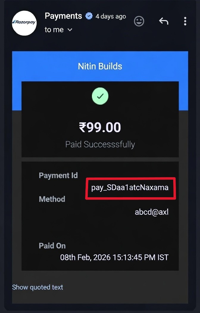 💡 Tip: The email subject is usually "Payment Receipt" or "Payment Successful". The Payment ID looks like: pay_SA7ABC123XYZ